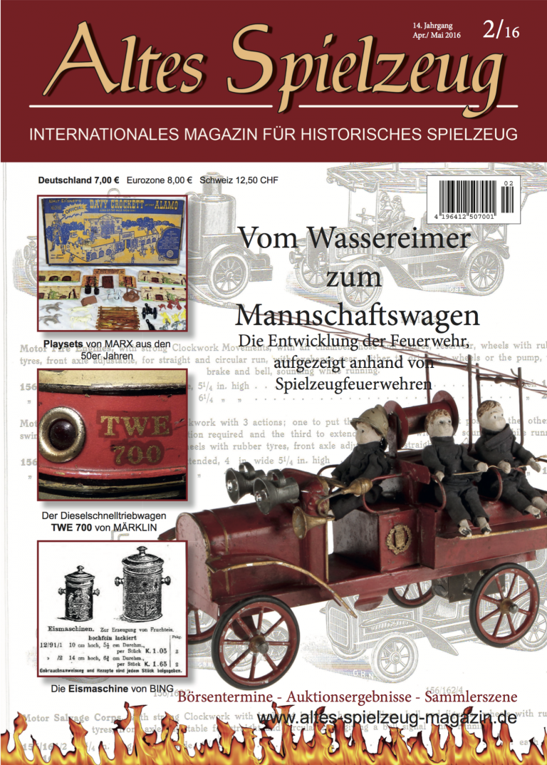 Die Ausgabe 02/16 des Magazins “Altes Spielzeug” erscheint Mitte März 2016. Das Hauptthema dieser Ausgabe ist “Vom Wassereimer zum Mannschaftswagen. Die Entwicklung der Feuerwehr”. Weitere Themen in diesem Heft: "Playsets der 50er Jahre von Louis Marx", "Die Eismaschine von BING" und "Schnelles Blech - der TWE 700 von Märklin". Wie immer werden die aktuellen Artikel ergänzt durch die beliebten Rubriken: Aktuelles Termine Auktionen + Märkte Gelesen + Gesehen Leserbriefe 56 Seiten geballte Informationen zu altem Spielzeug! Heft bestellen