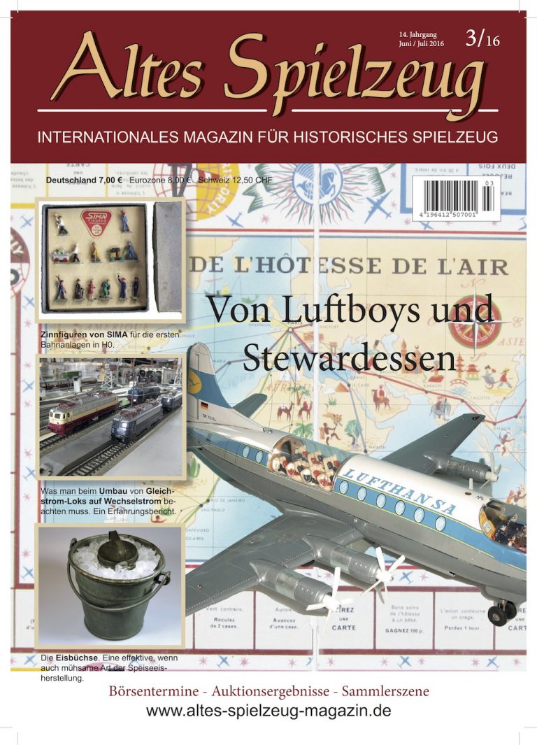 Die Ausgabe 03/16 des Magazins “Altes Spielzeug” erscheint Mitte Mai 2016. Das Hauptthema dieser Ausgabe ist “Von Luftboys und Stewardessen”. Weitere Themen in diesem Heft: "Zinn guren von SIMA" und "Die Eisbüchse von BING". Wie immer werden die aktuellen Artikel ergänzt durch die beliebten Rubriken: Aktuelles Termine Auktionen + Märkte Gelesen + Gesehen Leserbriefe 56 Seiten geballte Informationen zu altem Spielzeug! Heft bestellen