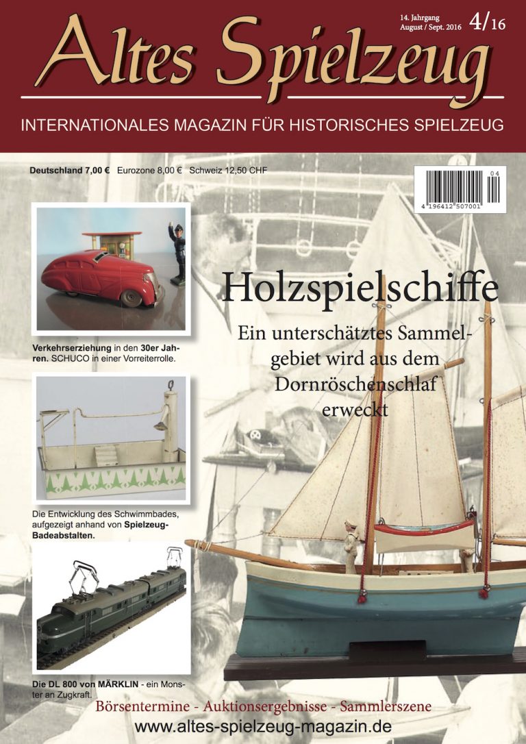 Die Ausgabe 04/16 des Magazins “Altes Spielzeug” erscheint Mitte Juli 2016. Das Hauptthema dieser Ausgabe ist “Holzspielschiffe”. Weitere Themen in diesem Heft: "Verkehrserziehung in den 30er Jahren. SCHUCO in einer Vorreiterrolle" und "Die Entwicklung des Schwimmbades, aufgezeigt anhand von Spielzeug- Badeabstalten." sowie "Die DL 800 von MÄRKLIN - ein Monster an Zugkraft". Wie immer werden die aktuellen Artikel ergänzt durch die beliebten Rubriken: Aktuelles Termine Auktionen + Märkte Gelesen + Gesehen Leserbriefe 56 Seiten geballte Informationen zu altem Spielzeug! Heft bestellen