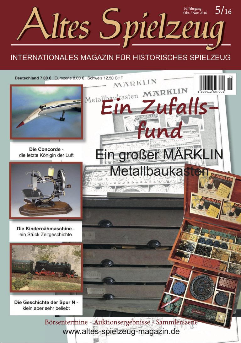 Die Ausgabe 05/16 des Magazins “Altes Spielzeug” erscheint Mitte September 2016. Das Hauptthema dieser Ausgabe ist “Zufallsfund: Metallbaukasten”. Weitere Themen in diesem Heft: "Die Concorde" und "Die Kindernähmaschine" sowie "Die Geschichte der Spur N". Wie immer werden die aktuellen Artikel ergänzt durch die beliebten Rubriken: Aktuelles Termine Auktionen + Märkte Gelesen + Gesehen Leserbriefe 56 Seiten geballte Informationen zu altem Spielzeug! Heft bestellen
