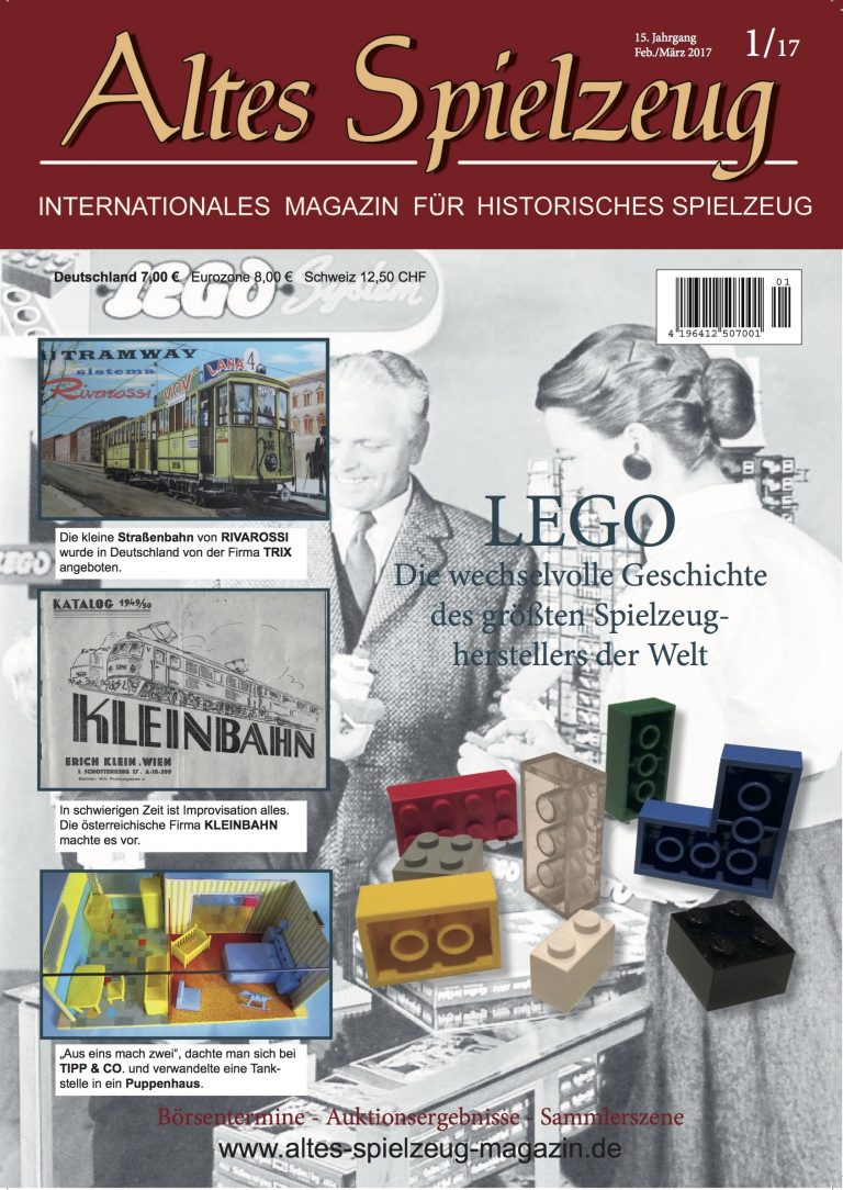Die Ausgabe 01/17 des Magazins “Altes Spielzeug” erscheint Mitte Januar 2017. Das Hauptthema dieser Ausgabe ist “LEGO”. Weitere Themen in diesem Heft: "Rivarossi Strassenbahn" und "Kleinbahn" sowie "Tipp & Co". Wie immer werden die aktuellen Artikel ergänzt durch die beliebten Rubriken: Aktuelles Termine Auktionen + Märkte Gelesen + Gesehen Leserbriefe 56 Seiten geballte Informationen zu altem Spielzeug! Heft bestellen