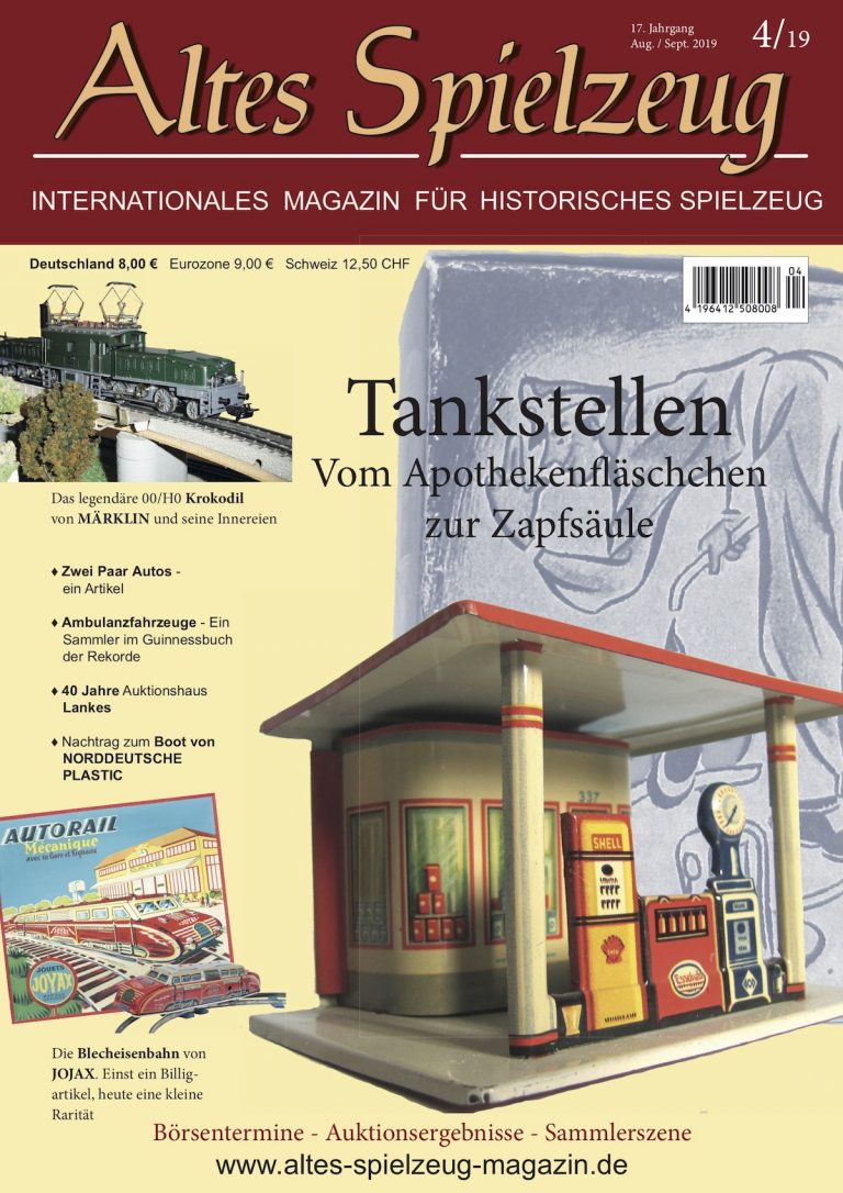 Die Ausgabe 03/19 des Magazins “Altes Spielzeug” erscheint Mitte Juli 2019. Das Hauptthema dieser Ausgabe ist “Tankstellen". Weitere Themen in diesem Heft: "Das Märklin Krokodil", "Ambulanzfahrzeuge", "40 Jahre Lankes" und "Blecheisenbahn JOJAX". Wie immer werden die aktuellen Artikel ergänzt durch die beliebten Rubriken: Aktuelles Termine Auktionen + Märkte Gelesen + Gesehen Leserbriefe Über 110 Seiten geballte Informationen zu altem Spielzeug! Heft bestellen