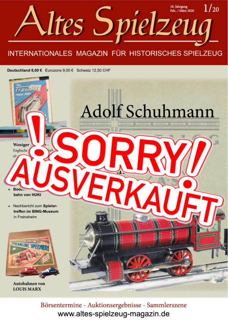 Die Ausgabe 01/20 des Magazins “Altes Spielzeug” erschien Mitte Januar 2020. Das Hauptthema dieser Ausgabe ist “Adolf Schuhmann“. Weitere Themen in diesem Heft: „Englisches Spur-00 Zubehör als Werbeträger", "Nachbericht zum unbekannten Puppenherd", "Bodenläufer und Tischbahn von HUKI", "Nachbericht zum Spielertreffen im BING-Museum in Freinsheim" sowie die "Autobahnen von LOUIS MARX. Wie immer werden die aktuellen Artikel ergänzt durch die beliebten Rubriken: Aktuelles Termine Auktionen + Märkte Gelesen + Gesehen Leserbriefe 60 Seiten geballte Informationen zu altem Spielzeug! Einzelheft bestellen Nutzen Sie bitte das Abo und bestellen Sie jetzt hier!