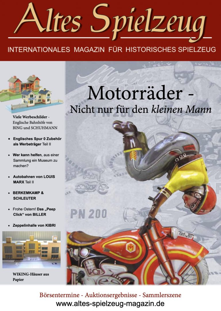 Die Ausgabe 02/20 des Magazins “Altes Spielzeug” erschien Mitte März 2020. Das Hauptthema dieser Ausgabe ist “Motorräder - Nicht nur für den kleinen Mann“. Weitere Themen in diesem Heft: Viele Werbeschilder - Englische Bahnhöfe von BING und SCHUHMANN Englisches Spur 0 Zubehör als Werbeträger Teil II Wer kann helfen, aus einer Sammlung ein Museum zu machen? Autobahnen von LOUIS MARX Teil II BERKEMKAMP & SCHLEUTER Frohe Ostern! Das „Peep Click“ von BILLER Zeppelinhalle von KIBRI WIKING-Häuser aus Papier Wie immer werden die aktuellen Artikel ergänzt durch die beliebten Rubriken:...