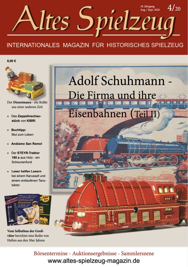 Die Ausgabe 04/20 des Magazins “Altes Spielzeug” erschien Mitte Juli 2020. Das Hauptthema dieser Ausgabe ist “Adolf Schuhmann - Die Firma und ihre Eisenbahnen (Teil II)“. Weitere Themen in diesem Heft: Der Dienstmann - ein Relikt aus einer anderen Zeit Das Zeppelinschaustück von KIBRI Buchtipp: Mut zum Leben Andiamo San Remo! Der STEYR-Traktor 180 a aus Holz - ein Scheunenfund Leser helfen Lesern bei einem Karussell und einem entlaufenen Tanzbären Vom Selbstbau der Großväter berichtet eine Reihe von Heften aus den 30er Jahren Wie immer werden die aktuellen Artikel ergänzt durch die...