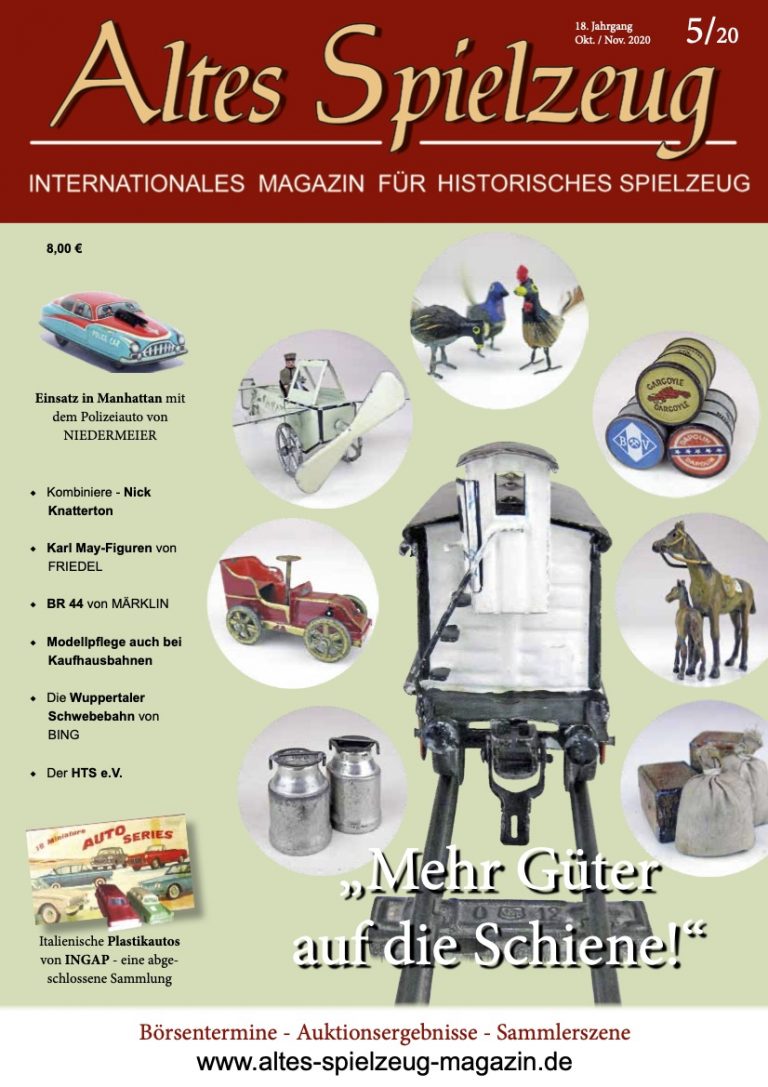 Die Ausgabe 05/20 des Magazins “Altes Spielzeug” erschien Mitte September 2020. Das Hauptthema dieser Ausgabe ist “Mehr Güter auf die Schiene!“. Weitere Themen in diesem Heft: Einsatz in Manhattan mit dem Polizeiauto von NIEDERMEIER Kombiniere - Nick Knatterton Karl May-Figuren von FRIEDEL BR 44 von MÄRKLIN Modellpflege auch bei Kaufhausbahnen Die Wuppertaler Schwebebahn von BING Der HTS e.V. Italienische Plastikautos von INGAP Wie immer werden die aktuellen Artikel ergänzt durch die beliebten Rubriken: Aktuelles Termine Auktionen + Märkte Gelesen + Gesehen Leserbriefe 60 Seiten geballte Informationen zu altem Spielzeug! Das Magazin...