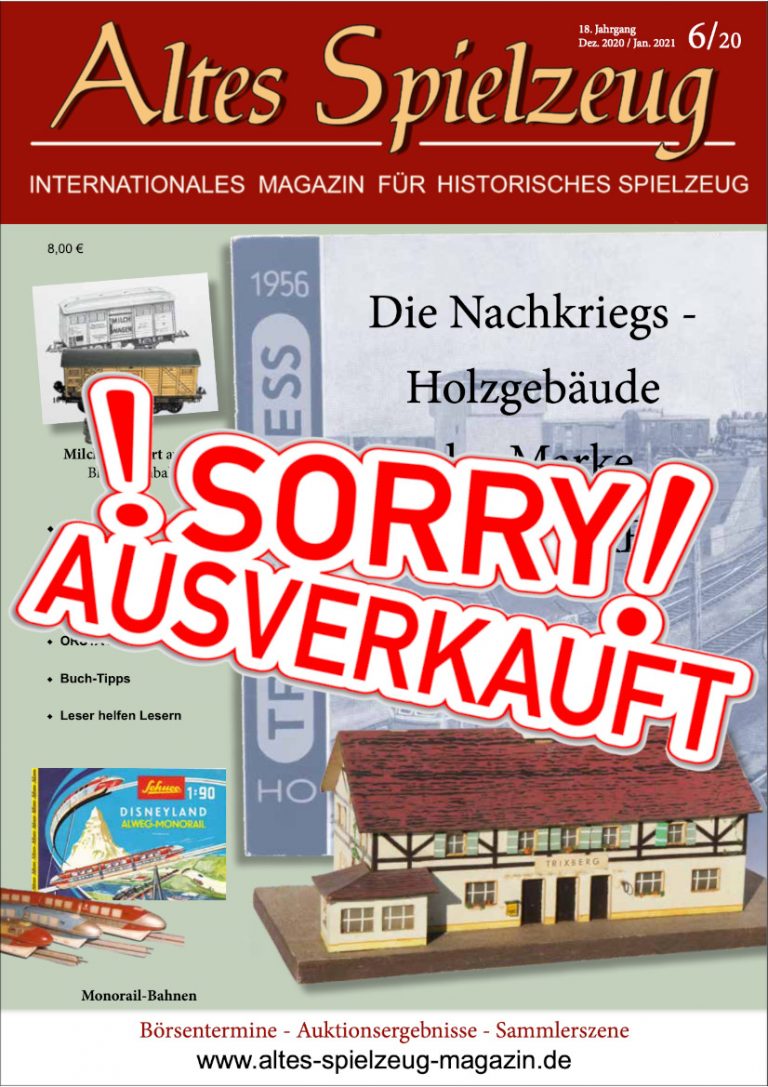 Die Ausgabe 06/20 des Magazins “Altes Spielzeug” erschien Mitte November 2020. Das Hauptthema dieser Ausgabe ist “Die Nachkriegs - Holzgebäude der Marke TRIX EXPRESS“. Weitere Themen in diesem Heft: Milchtransport auf der Blecheisenbahn Die Geschirrspülmaschine Prüfsiegel von MÄRKLIN Deckelbilder Teil II ORSTAModelltechnik Monorail-Bahnen Buch-Tipps Leser helfen Lesern Wie immer werden die aktuellen Artikel ergänzt durch die beliebten Rubriken: Aktuelles Termine Auktionen + Märkte Gelesen + Gesehen Leserbriefe 60 Seiten geballte Informationen zu altem Spielzeug! Nutzen Sie bitte das Abo und bestellen Sie jetzt hier!