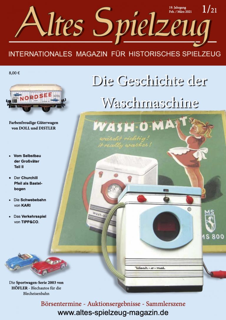 Die Ausgabe 01/21 des Magazins “Altes Spielzeug” erschien Mitte Januar 2021. Das Hauptthema dieser Ausgabe ist “Die Geschichte der Waschmaschine“. Weitere Themen in diesem Heft: Farbenfreudige Güterwagen von DOLL und DISTLER Vom Selbstbau der Großväter Teil II Der Churchill Pfeil als Bastelbogen Die Schwebebahn von KARI Das Verkehrsspiel von TIPP&CO Die Sportwagen-Serie 2003 von HÖFLER - Blechautos für die Blecheisenbahn Wie immer werden die aktuellen Artikel ergänzt durch die beliebten Rubriken: Aktuelles Termine Auktionen + Märkte Gelesen + Gesehen Leserbriefe 60 Seiten geballte Informationen zu altem Spielzeug! Einzelheft bestellen Nutzen...