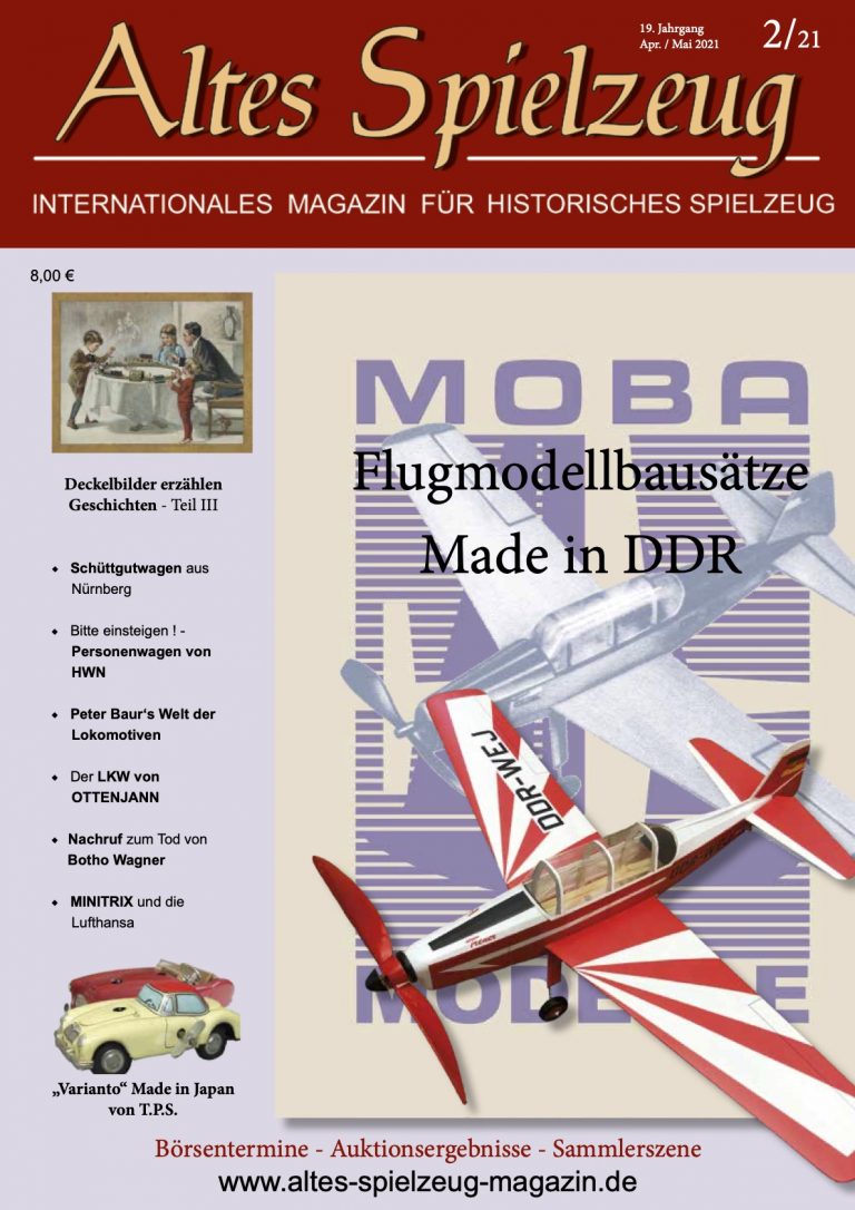 Die Ausgabe 02/21 des Magazins “Altes Spielzeug” erschien Mitte März 2021. Das Hauptthema dieser Ausgabe ist “MOBA Flugmodellbausätze, Made in DDR“. Weitere Themen in diesem Heft: Deckelbilder erzählen Geschichten - Teil III Schüttgutwagen aus Nürnberg Bitte einsteigen ! - Personenwagen von HWN Peter Baur‘s Welt der Lokomotiven Der LKW von OTTENJANN Nachruf zum Tod von Botho Wagner MINITRIX und die Lufthansa „Varianto“ Made in Japan von T.P.S. Wie immer werden die aktuellen Artikel ergänzt durch die beliebten Rubriken: Aktuelles Termine Auktionen + Märkte Gelesen + Gesehen Leserbriefe 60 Seiten geballte...