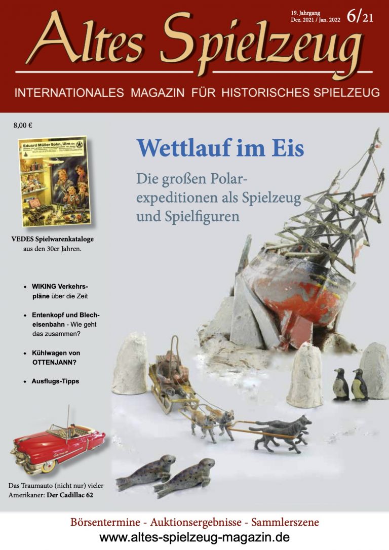Die Ausgabe 06/21 des Magazins “Altes Spielzeug” erschien Mitte November 2021. Das Hauptthema dieser Ausgabe ist “Wettlauf im Eis - Die großen Polarexpeditionen als Spielzeug und Spielfiguren“. Weitere Themen in diesem Heft: VEDES Spielwarenkataloge aus den 30er Jahren. WIKING Verkehrspläne über die Zeit Entenkopf und Blech- eisenbahn - Wie geht das zusammen? Kühlwagen von OTTENJANN? Ausflugs-Tipps Das Traumauto (nicht nur) vieler Amerikaner: Der Cadillac 62 Wie immer werden die aktuellen Artikel ergänzt durch die beliebten Rubriken: Aktuelles Termine Auktionen + Märkte Leserbriefe 60 Seiten geballte Informationen zu altem Spielzeug! Einzelheft bestellen...