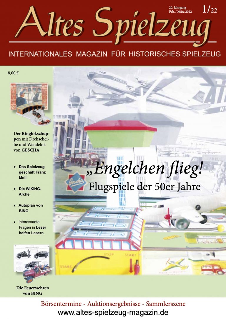 Die Ausgabe 01/22 des Magazins “Altes Spielzeug” erschien Mitte Januar 2022. Das Hauptthema dieser Ausgabe ist “Engelchen flieg! Flugspiele der 50er Jahre“. Weitere Themen in diesem Heft: Der Ringlokschuppen mit Drehscheibe und Wendelok von GESCHA Das Spielzeuggeschäft Franz Moll Die WIKING-Arche Autoplan von BING Die Feuerwehren von BING Wie immer werden die aktuellen Artikel ergänzt durch die beliebten Rubriken: Aktuelles Termine Auktionen + Märkte Leserbriefe 60 Seiten geballte Informationen zu altem Spielzeug! Einzelheft bestellen Nutzen Sie bitte das Abo und bestellen Sie jetzt hier!