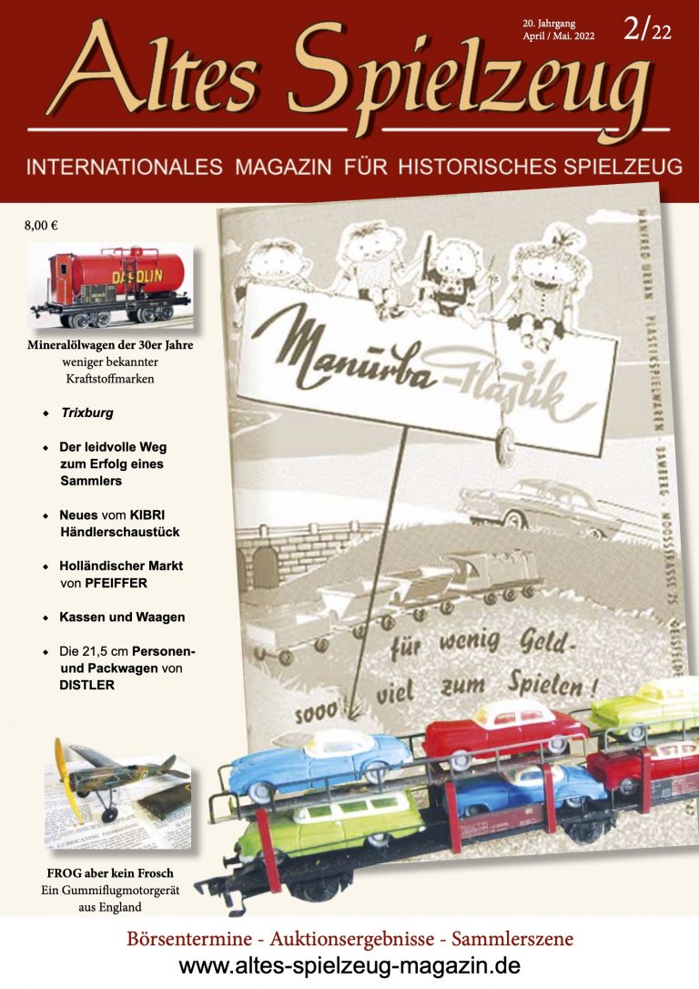 Die Ausgabe 02/22 des Magazins “Altes Spielzeug” erschien Mitte März 2022. Das Hauptthema dieser Ausgabe ist “Manurba-Plastik“. Weitere Themen in diesem Heft: Mineralölwagen der 30er Jahre weniger bekannter Kraftstoffmarken Trixburg Der leidvolle Weg zum Erfolg eines Sammlers Neues vom KIBRI Händlerschaustück Holländischer Markt von PFEIFFER Kassen und Waagen Die 21,5 cm Personen- und Packwagen von DISTLER FROG aber kein Frosch Ein Gummiflugmotorgerät aus England Wie immer werden die aktuellen Artikel ergänzt durch die beliebten Rubriken: Aktuelles Termine Auktionen + Märkte Leserbriefe 60 Seiten geballte Informationen zu altem Spielzeug! Einzelheft bestellen Nutzen...