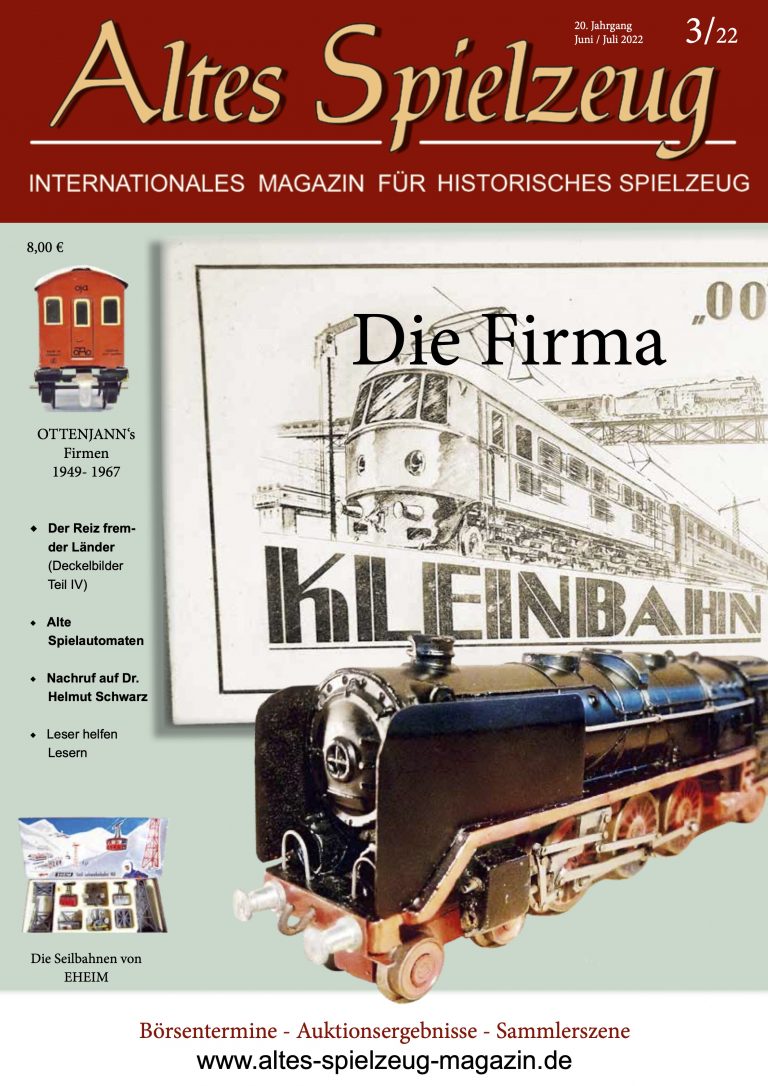 Die Ausgabe 03/22 des Magazins “Altes Spielzeug” erschien Mitte Mai 2022. Das Hauptthema dieser Ausgabe ist “Die Firma Kleinbahn“. Weitere Themen in diesem Heft: OTTENJANN‘s Firmen 1949- 1967 Der Reiz fremder Länder (Deckelbilder Teil IV) Alte Spielautomaten Nachruf auf Dr. Helmut Schwarz Die Seilbahnen von EHEIM Wie immer werden die aktuellen Artikel ergänzt durch die beliebten Rubriken: Aktuelles Termine Auktionen + Märkte Leserbriefe 60 Seiten geballte Informationen zu altem Spielzeug! Einzelheft bestellen Nutzen Sie bitte das Abo und bestellen Sie jetzt hier!