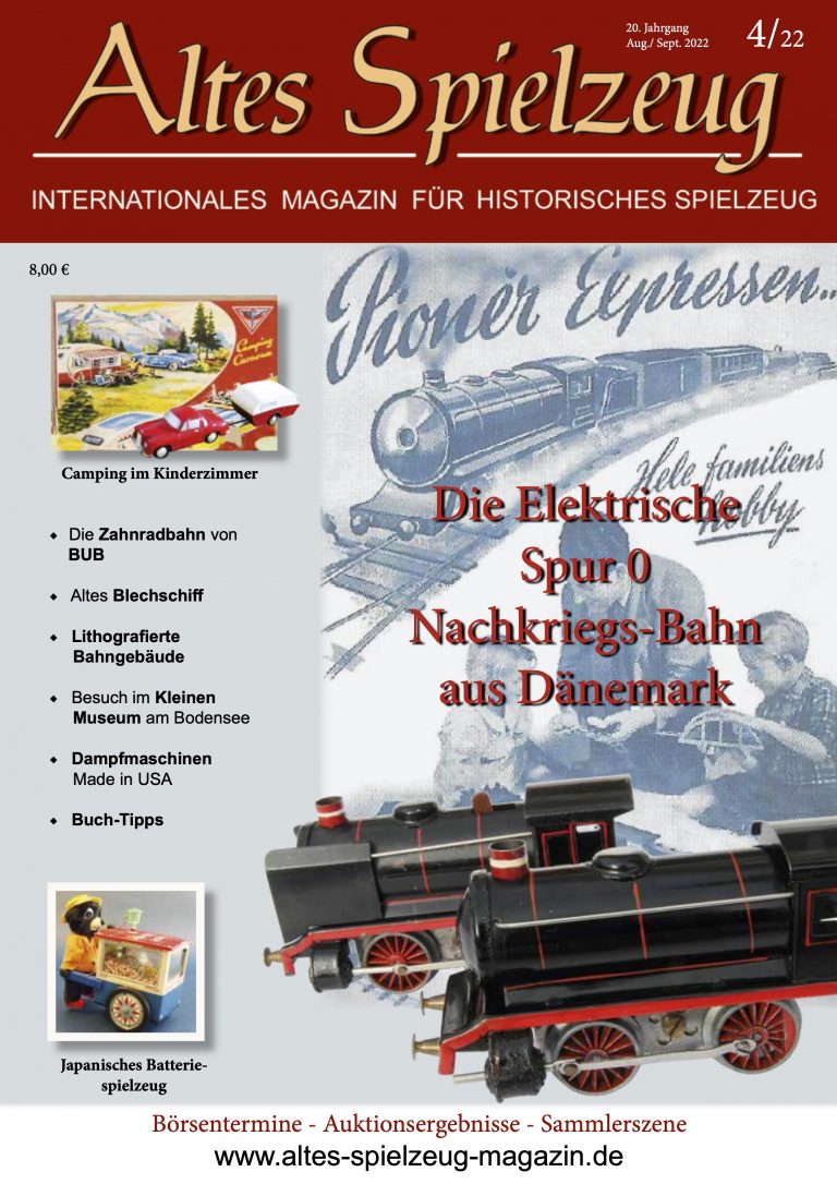 Die Ausgabe 04/22 des Magazins “Altes Spielzeug” erschien Mitte Juli 2022. Das Hauptthema dieser Ausgabe ist “Pionér Expressen - Die Elektrische Spur 0 Nachkriegs-Bahn aus Dänemark“. Weitere Themen in diesem Heft: Camping im Kinderzimmer Die Zahnradbahn von BUB Altes Blechschiff Lithografierte Bahngebäude Besuch im Kleinen Museum am Bodensee Dampfmaschinen Made in USA Buch-Tipps Japanisches Batteriespielzeug Wie immer werden die aktuellen Artikel ergänzt durch die beliebten Rubriken: Aktuelles Termine Auktionen + Märkte Leserbriefe 60 Seiten geballte Informationen zu altem Spielzeug! Einzelheft bestellen Nutzen Sie bitte das Abo und bestellen Sie jetzt hier!
