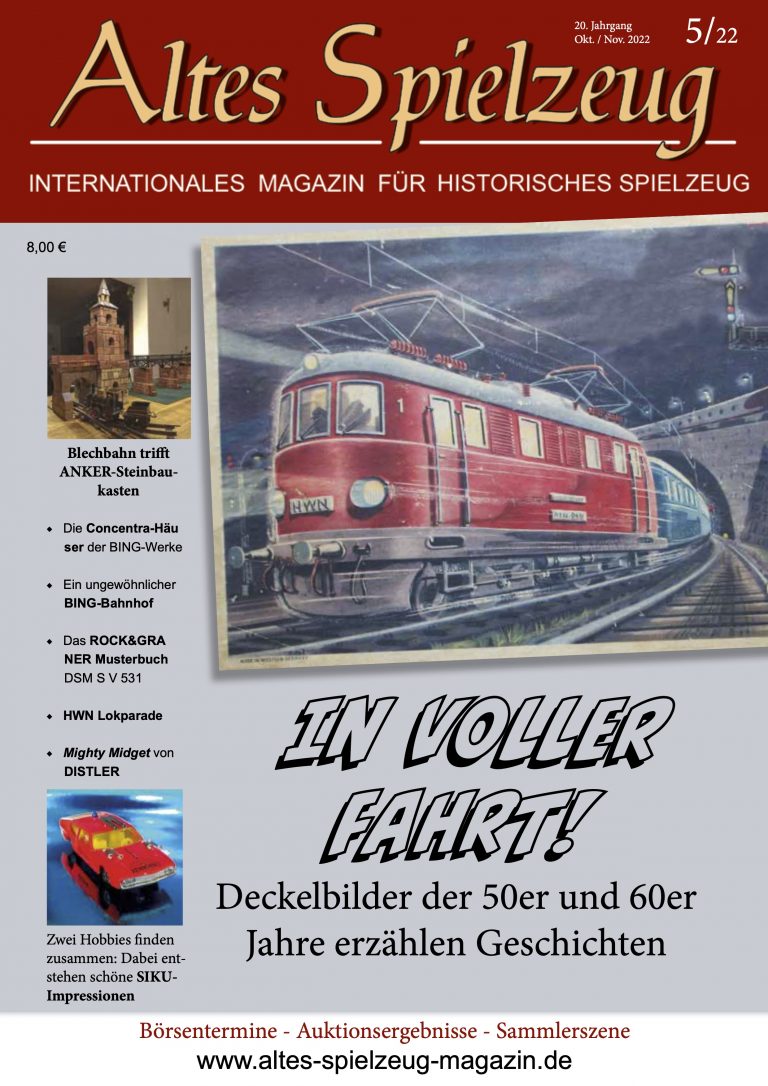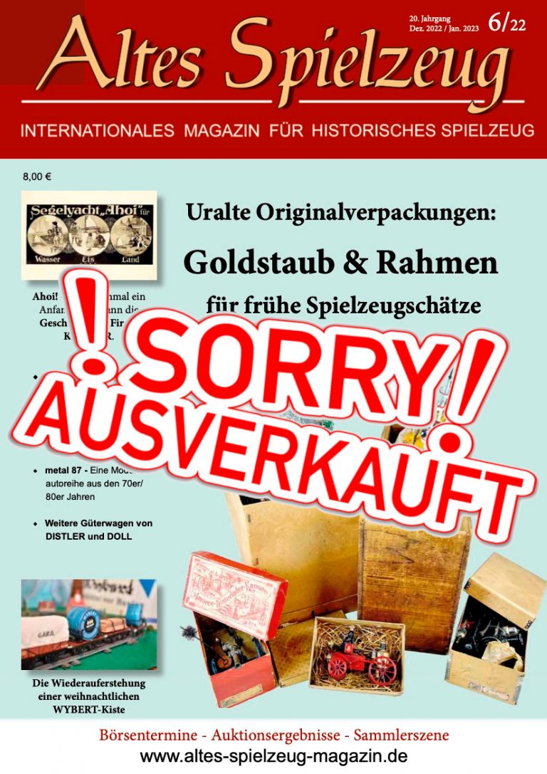 Die Ausgabe 6/22 des Magazins “Altes Spielzeug” erschien Mitte November 2022. Das Hauptthema dieser Ausgabe ist “Uralte Originalverpackungen: Goldstaub & Rahmen für frühe Spielzeugschätze“. Weitere Themen in diesem Heft: Ahoi! - Es war einmal ein Anfang. So begann die Geschichte der Firma KELLNER. TRIXBURG - Schaustücke und Werbemittel von TRIX Ein Puzzle von G. J. HAYTER metal 87 - Eine Modellautoreihe aus den 70er/ 80er Jahren Weitere Güterwagen von DISTLER und DOLL Die Wiederauferstehung einer weihnachtlichen WYBERT-Kiste Wie immer werden die aktuellen Artikel ergänzt durch die beliebten Rubriken: Aktuelles Termine Auktionen...