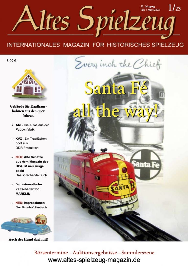 Die Ausgabe 1/23 des Magazins “Altes Spielzeug” erschien Mitte Januar 2023. Das Hauptthema dieser Ausgabe ist “Santa Fé all the way“. Weitere Themen in diesem Heft: Gebäude für Kaufhaus- bahnen aus den 60er Jahren ARI - Die Autos aus der Puppenfabrik KVZ - Ein Tragflächenboot aus DDR Produktion NEU: Alte Schätze aus dem Magazin des HP&SM neu ausgepackt Das sprechende Buch Der automatische Zeitschalter von MÄRKLIN NEU: Impressionen - Der Bahnhof Simbach Auch der Hund darf mit! Wie immer werden die aktuellen Artikel ergänzt durch die beliebten Rubriken: Aktuelles Termine Auktionen +...