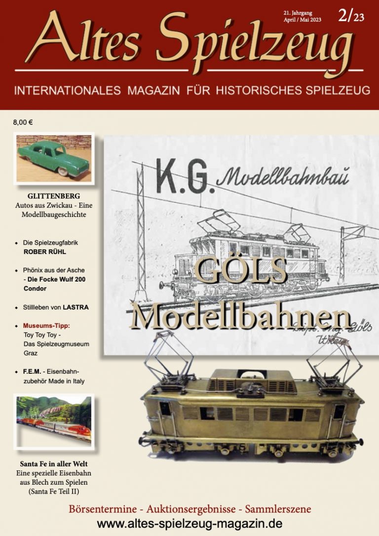 Die Ausgabe 2/23 des Magazins “Altes Spielzeug” erschien Mitte März 2023. Das Hauptthema dieser Ausgabe ist "Görs Modellbahnen". Weitere Themen in diesem Heft: GLITTENBERG - Autos aus Zwickau - Eine Modellbaugeschichte Die Spielzeugfabrik ROBER RÜHL Phönix aus der Asche - Die Focke Wulf 200 Condor Stillleben von LASTRA Museums-Tipp: Toy Toy Toy - Das Spielzeugmuseum Graz F.E.M. - Eisenbahnzubehör Made in Italy Santa Fe in aller Welt - Eine spezielle Eisenbahn aus Blech zum Spielen (Santa Fe Teil II) Wie immer werden die aktuellen Artikel ergänzt durch die beliebten Rubriken: Aktuelles Termine Auktionen +...