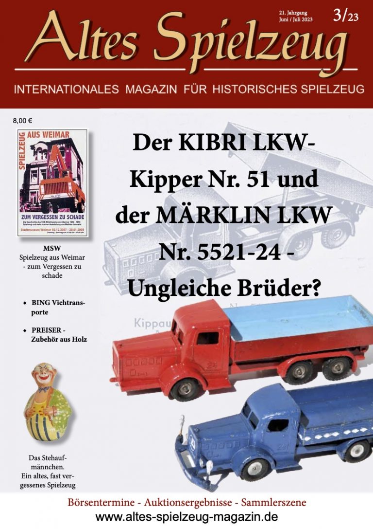 Die Ausgabe 3/23 des Magazins “Altes Spielzeug” erschien Mitte Mai 2023. Das Hauptthema dieser Ausgabe ist "Der KIBRI LKW- Kipper Nr. 51 und der MÄRKLIN LKW Nr. 5521-24 - Ungleiche Brüder?". Weitere Themen in diesem Heft: MSW Spielzeug aus Weimar - zum Vergessen zu schade BING Viehtransporte PREISER - Zubehör aus Holz Das Stehauf- männchen. Ein altes, fast vergessenes Spielzeug Wie immer werden die aktuellen Artikel ergänzt durch die beliebten Rubriken: Aktuelles Termine Auktionen + Märkte Leserbriefe 60 Seiten geballte Informationen zu altem Spielzeug! Einzelheft bestellen Nutzen Sie bitte...