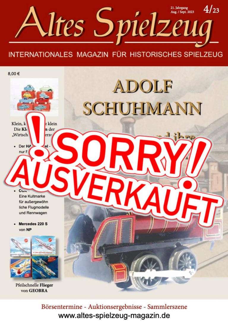 Die Ausgabe 4/23 des Magazins “Altes Spielzeug” erschien Mitte Juli 2023. Das Hauptthema dieser Ausgabe ist "ADOLF SCHUHMANN - Die Firma und ihre Eisenbahnen Teil IV". Weitere Themen in diesem Heft: Klein, kleiner, ganz klein Die Kleinstwagen der „Wirtschaftswunderzeit“ Der HAPP-Vogel - nur Fliegen ist schöner Phönix aus der Asche - Ein Zwischenbericht COX - Eine Kultmarke für außergewöhnliche Flugmodelle und Rennwagen Mercedes 220 S von NP Pfeilschnelle Flieger von GEOBRA Wie immer werden die aktuellen Artikel ergänzt durch die beliebten Rubriken: Aktuelles Termine Auktionen + Märkte Leserbriefe 60...