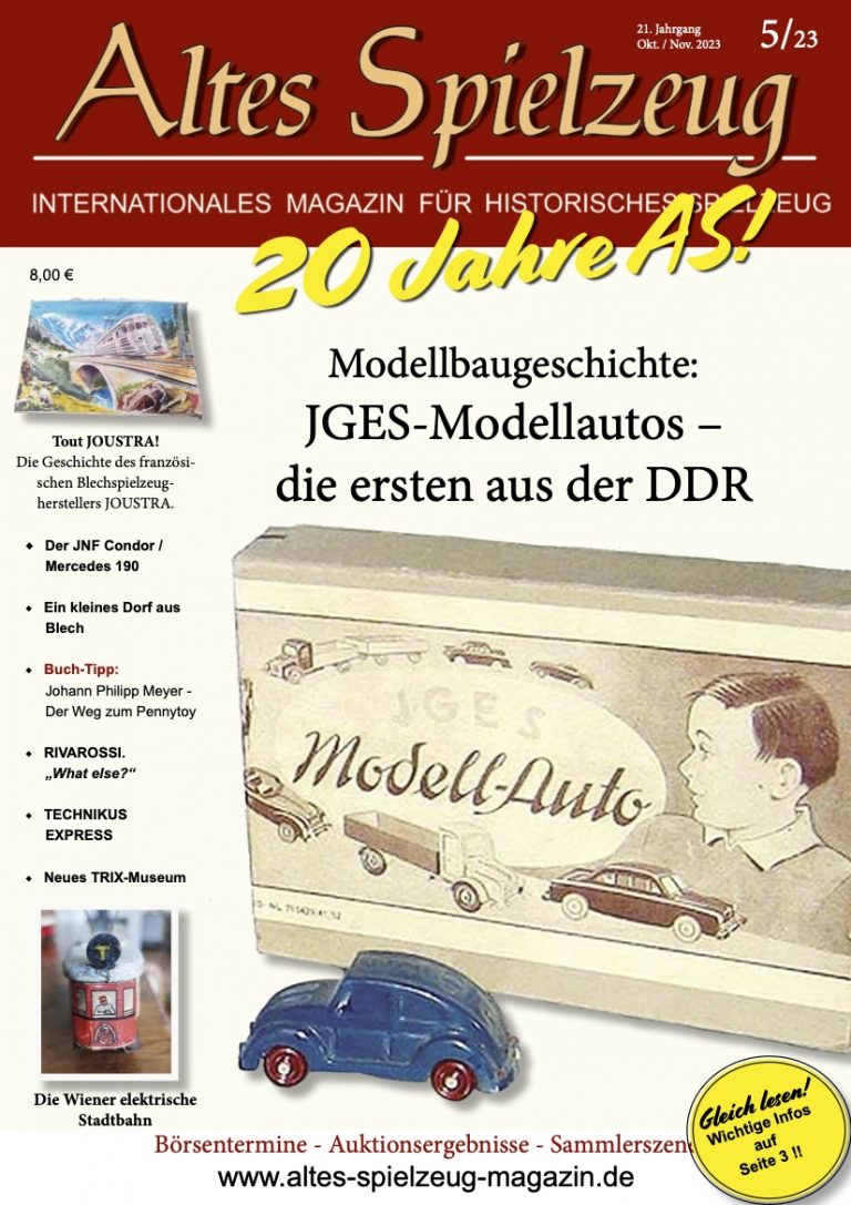 Die Ausgabe 5/23 des Magazins “Altes Spielzeug” erschien Mitte September 2023. Das Hauptthema dieser Ausgabe ist " Modellbaugeschichte: JGES-Modellautos – die ersten aus der DDR". Weitere Themen in diesem Heft: Tout JOUSTRA! Die Geschichte des französischen Blechspielzeugherstellers JOUSTRA. Der JNF Condor / Mercedes 190 Ein kleines Dorf aus Blech Buch-Tipp: Johann Philipp Meyer - Der Weg zum Pennytoy RIVAROSSI. „What else?“ TECHNIKUS EXPRESS Neues TRIX-Museum Die Wiener elektrische Stadtbahn Wie immer werden die aktuellen Artikel ergänzt durch die beliebten Rubriken: Aktuelles Termine Auktionen + Märkte Leserbriefe 60 Seiten geballte...