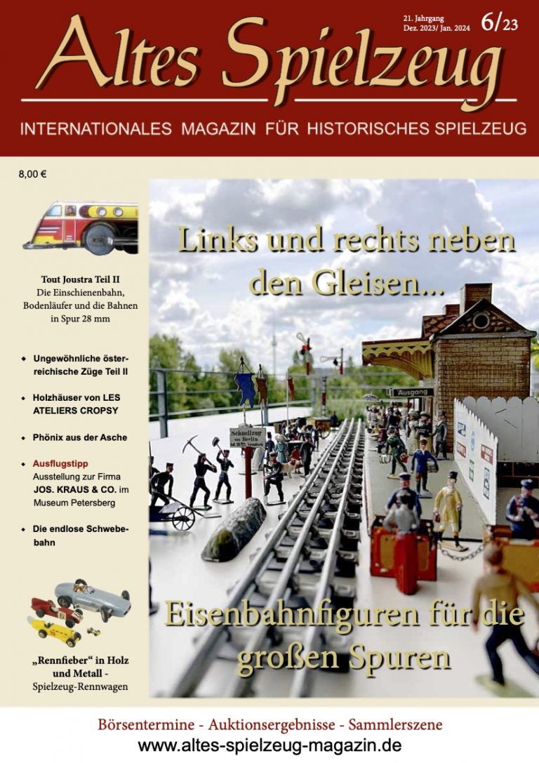 Die Ausgabe 6/23 des Magazins “Altes Spielzeug” erschien Mitte November 2023. Das Hauptthema dieser Ausgabe ist "Links und rechts neben den Gleisen... Eisenbahnfiguren für die großen Spuren". Weitere Themen in diesem Heft: Tout Joustra Teil II - Die Einschienenbahn, Bodenläufer und die Bahnen in Spur 28 mm Ungewöhnliche österreichische Züge Teil II Holzhäuser von LES ATELIERS CROPSY Phönix aus der Asche Ausflugstipp Ausstellung zur Firma JOS. KRAUS & CO. im Museum Petersberg Die endlose Schwebebahn „Rennfieber“ in Holz und Metall - Spielzeug-Rennwagen Wie immer werden die aktuellen Artikel ergänzt durch...