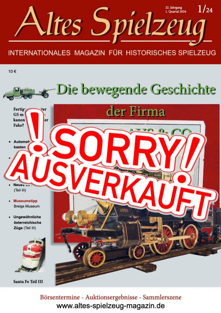 Die Ausgabe 1/24 des Magazins “Altes Spielzeug” erschien Anfang Februar 2024. Das Hauptthema dieser Ausgabe ist "Die bewegende Geschichte der Firma JOS. KRAUS & CO.". Weitere Themen in diesem Heft: Fertigungsmuster G5 mit Anhängekanone - Fakt oder Fake? Automobilbau-kasten aus Holz Der Verein Historische Spielzeugeisenbahnen e.V. stellt sich vor Neues zu JOUSTRA (Teil III) Museumstipp Breigs Museum Ungewöhnliche österreichische Züge (Teil III) Santa Fe Teil III Wie immer werden die aktuellen Artikel ergänzt durch die beliebten Rubriken: Aktuelles Termine Auktionen + Märkte Leserbriefe 60 Seiten geballte Informationen zu altem Spielzeug!...