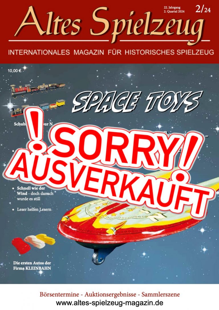 Die Ausgabe 2/24 des Magazins “Altes Spielzeug” erschien Ende April 2024. Das Hauptthema dieser Ausgabe ist „SPACE TOYS - Raumfahrtträume für Sammler - so beliebt wie noch nie". Weitere Themen in diesem Heft: Schubzüge in Spur N Wohnhäuser von BING Phönix aus der Asche - Abschluss- bericht Schnell wie der Wind - doch danach wurde es still Die ersten Autos der Firma Kleinbahn Wie immer werden die aktuellen Artikel ergänzt durch die beliebten Rubriken: Aktuelles Termine Auktionen + Märkte Leserbriefe 60 Seiten geballte Informationen zu altem Spielzeug! Einzelheft bestellen Nutzen...