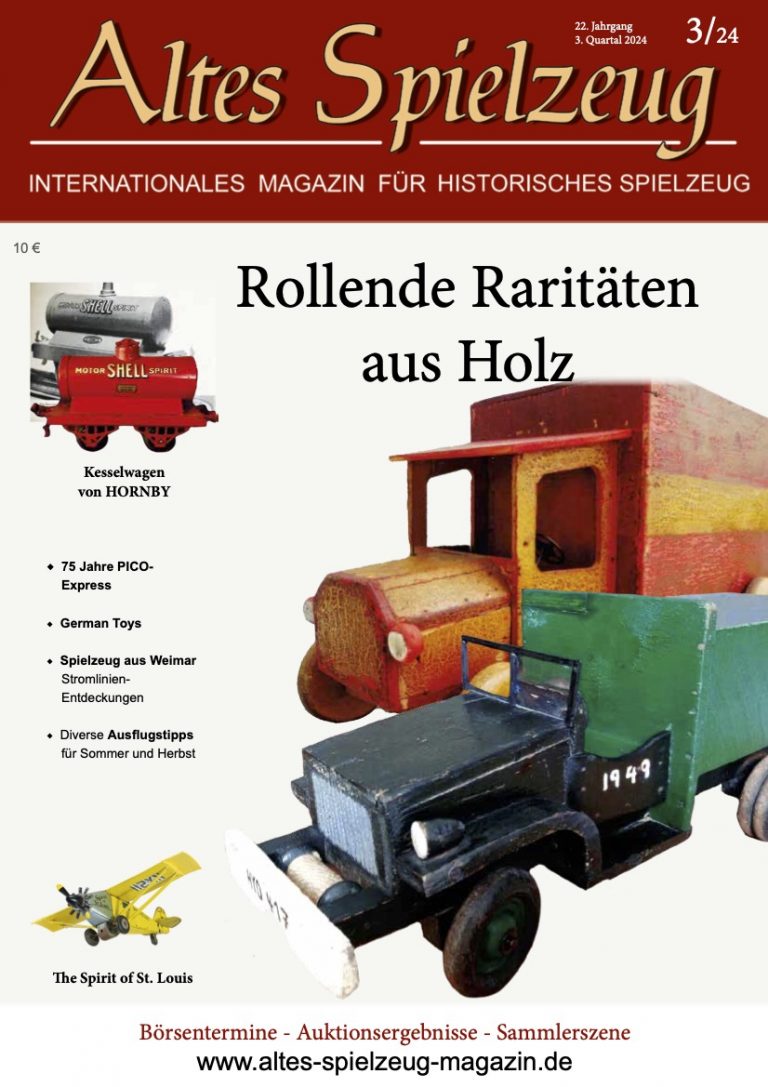 Die Ausgabe 3/24 des Magazins “Altes Spielzeug” erschien Ende Juli 2024. Das Hauptthema dieser Ausgabe ist „Rollende Raritäten aus Holz". Weitere Themen in diesem Heft: Kesselwagen von HORNBY 75 Jahre PICO-Express German Toys Spielzeug aus Weimar - Stromlinien-Entdeckungen Diverse Ausflugstipps für Sommer und Herbst 1949 The Spirit of St. Louis Wie immer werden die aktuellen Artikel ergänzt durch die beliebten Rubriken: Aktuelles Termine Auktionen + Märkte Leserbriefe 60 Seiten geballte Informationen zu altem Spielzeug! Einzelheft bestellen Nutzen Sie bitte das Abo und bestellen Sie jetzt hier!