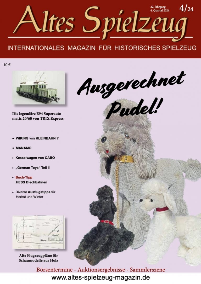 Die Ausgabe 4/24 des Magazins “Altes Spielzeug” erschien Ende Oktober 2024. Das Hauptthema dieser Ausgabe ist „Ausgerechnet Pudel". Weitere Themen in diesem Heft: Die legendäre E94 Superautomatic 20/60 von TRIX Express WIKING von KLEINBAHN ? MANAMO Kesselwagen von CABO „German Toys“ Teil II Buch-Tipp: HESS Blechbahnen Diverse Ausflugstipps für Herbst und Winter Alte Flugzeugpläne für Schaumodelle aus Holz Wie immer werden die aktuellen Artikel ergänzt durch die beliebten Rubriken: Aktuelles Termine Auktionen + Märkte Leserbriefe 60 Seiten geballte Informationen zu altem Spielzeug! Einzelheft bestellen Nutzen Sie bitte das Abo und...