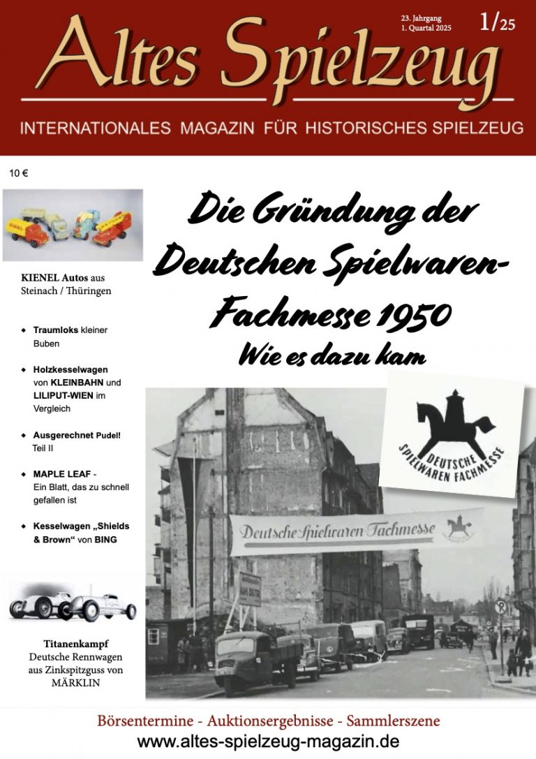 Die Ausgabe 1/25 des Magazins “Altes Spielzeug” erschien Ende Januar 2025. Das Hauptthema dieser Ausgabe ist „Die Gründung der Deutschen Spielwaren-Fachmesse 1950 - Wie es dazu kam". Weitere Themen in diesem Heft: KIENEL Autos aus Steinach / Thüringen Traumloks kleiner Buben Holzkesselwagen von KLEINBAHN und LILIPUT-WIEN im Vergleich Ausgerechnet Pudel! Teil Il MAPLE LEAF - Ein Blatt, das zu schnell gefallen ist Kesselwagen „Shields & Brown" von BING Titanenkampf Deutsche Rennwagen aus Zinkspitzguss von MÄRKLIN Wie immer werden die aktuellen Artikel ergänzt durch die beliebten Rubriken: Aktuelles Termine Auktionen...