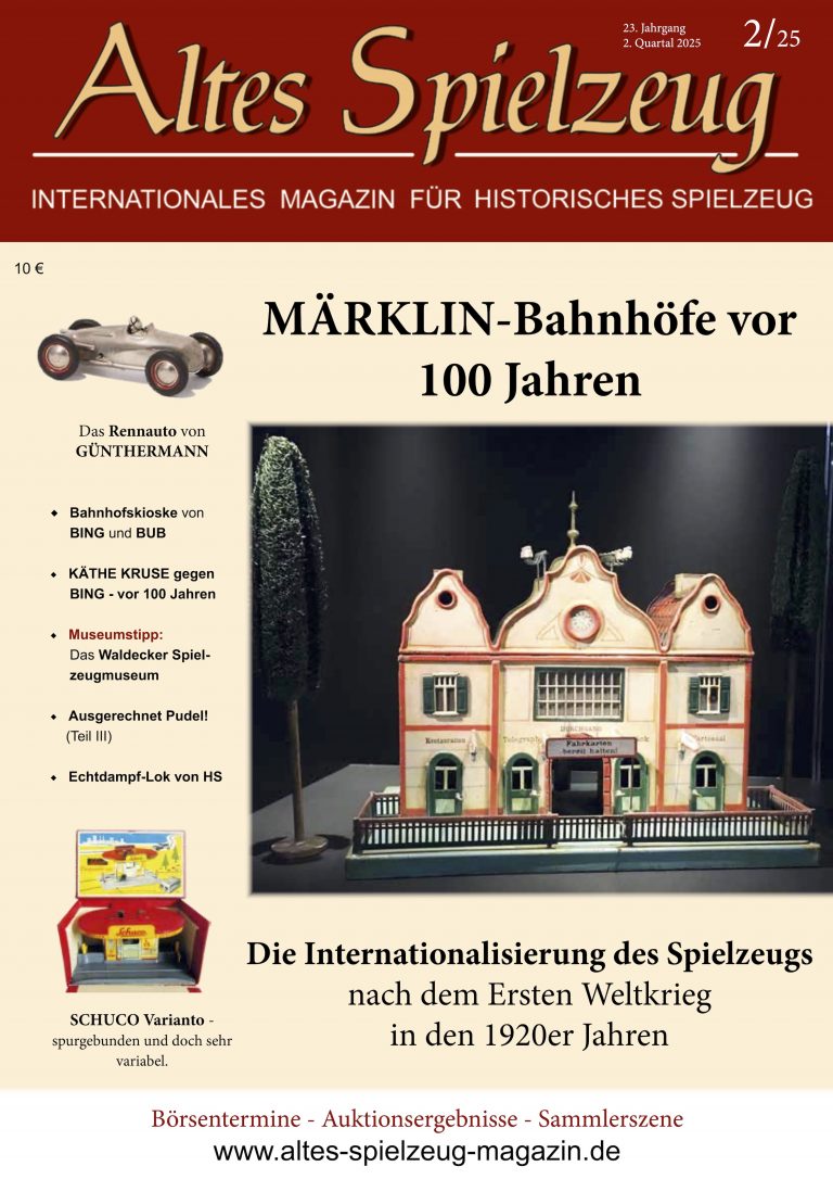 Die Ausgabe 2/25 des Magazins “Altes Spielzeug” erschien Ende April 2025. Das Hauptthema dieser Ausgabe ist „MÄRKLIN-Bahnhöfe vor 100 Jahren". Weitere Themen in diesem Heft: Das Rennauto von GÜNTHERMANN Bahnhofskioske von BING und BUB KÄTHE KRUSE gegen BING - vor 100 Jahren Museumstipp: Das Waldecker Spielzeugmuseum Ausgerechnet Pudel! (Teil III) Echtdampf-Lok von HS SCHUCO Varianto - spurgebunden und doch sehr variabel Wie immer werden die aktuellen Artikel ergänzt durch die beliebten Rubriken: Aktuelles Termine Auktionen + Märkte Leserbriefe 60 Seiten geballte Informationen zu altem Spielzeug! Einzelheft bestellen Nutzen Sie bitte...