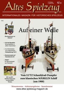 Die Ausgabe 4/25 des Magazins “Altes Spielzeug” erschien Ende September 2025. Das Hauptthema dieser Ausgabe ist „Auf einer Welle - Vom LUTZ Schaufelrad-Dampfer zum klassischen MÄRKLIN Schiff (um 1900)". Weitere Themen in diesem Heft: Blechspielzeug von DISNEY Auf der Baustelle - Schachtelbilder erzählen Geschichten Von Ähnlichkeiten und Unterschieden - Holzspielzeug Teil II Nummernsalat auf französische Art TRUST - Ein Monopolyspiel aus Österreich BW von BW - Bahnbetriebswerke von den BING-Werken Wie immer werden die aktuellen Artikel ergänzt durch die beliebten Rubriken: Aktuelles Termine Auktionen + Märkte Leserbriefe 60 Seiten geballte...