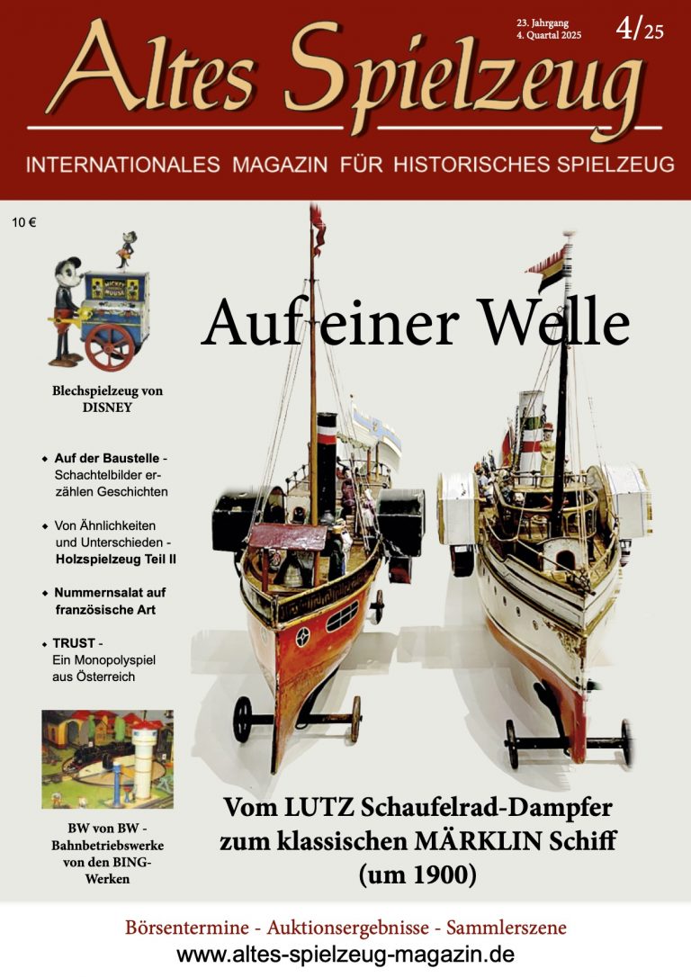 Die Ausgabe 4/25 des Magazins “Altes Spielzeug” erschien im November 2025. Das Hauptthema dieser Ausgabe ist „Auf einer Welle - Vom LUTZ Schaufelrad-Dampfer zum klassischen MÄRKLIN Schiff (um 1900)". Weitere Themen in diesem Heft: Blechspielzeug von DISNEY Auf der Baustelle - Schachtelbilder erzählen Geschichten Von Ähnlichkeiten und Unterschieden - Holzspielzeug Teil II Nummernsalat auf französische Art TRUST - Ein Monopolyspiel aus Österreich BW von BW - Bahnbetriebswerke von den BING-Werken Wie immer werden die aktuellen Artikel ergänzt durch die beliebten Rubriken: Aktuelles Termine Auktionen + Märkte Leserbriefe 60 Seiten geballte...